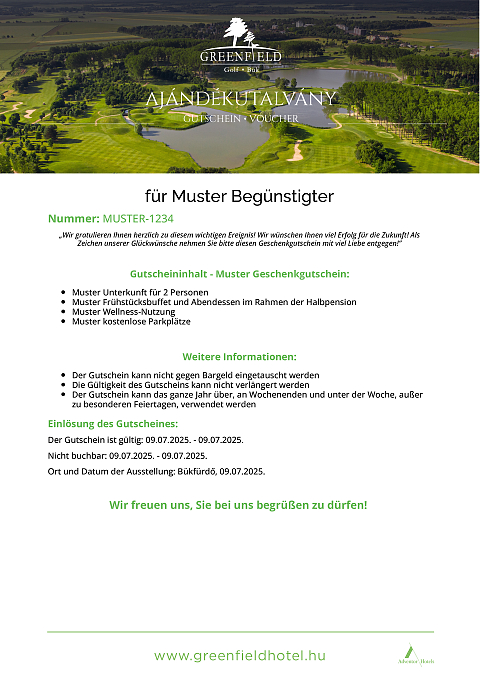 - Mit dem Gutschein erhalten Sie von Freitag bis Sonntag 1 Mal kostenlose Greenfees für eine Person auf dem internationalen 18-Loch-Golfplatz Greenfield.